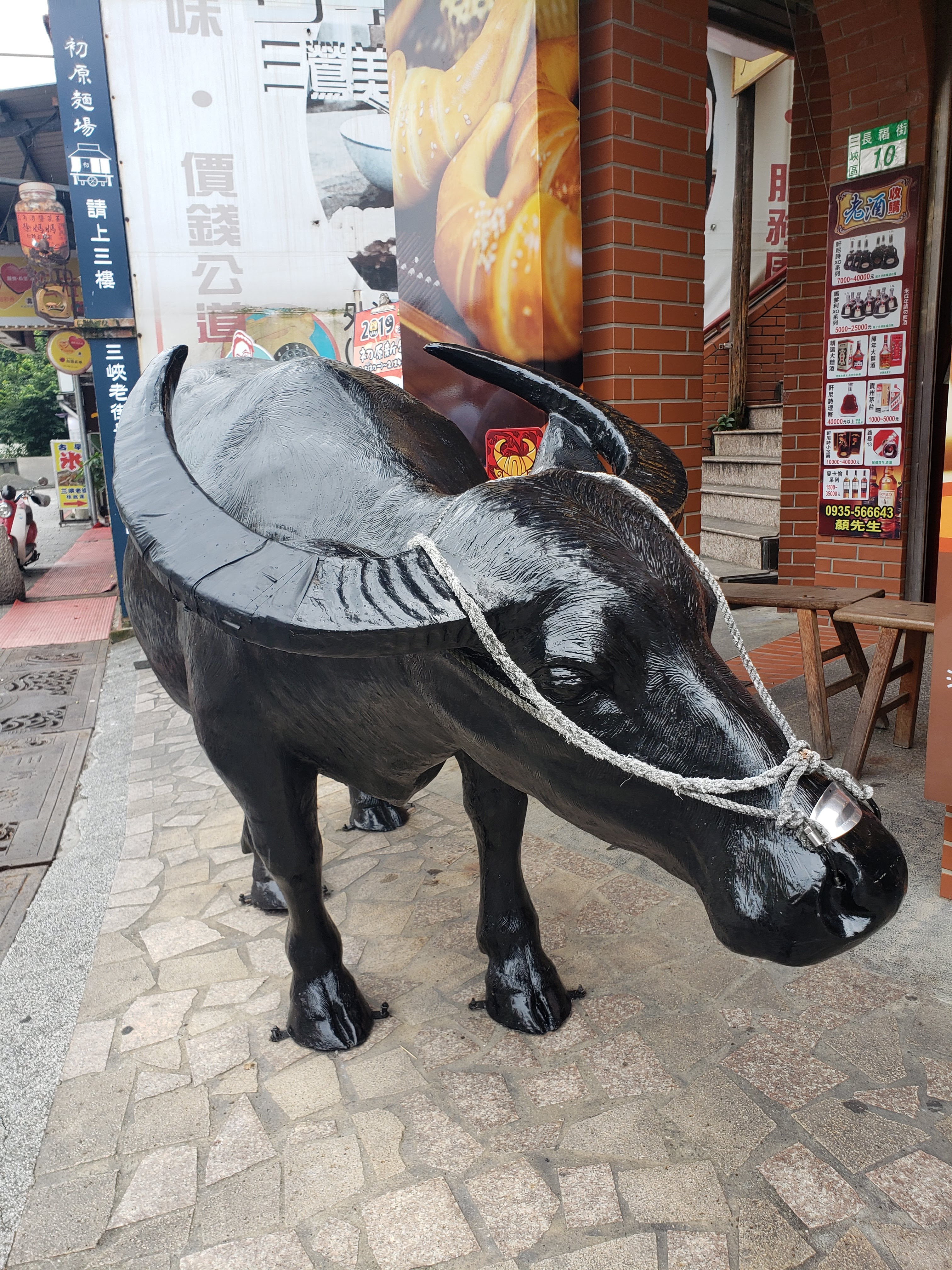 Sanxia, it turns out, is a historical area that grew out of the convergence of two rivers, and once held bustling agricultural, forestry, and mining communities. These days, it’s a thriving center for culture and the arts, with an Old Street packed with vendors and store fronts. On the advice of our taxi driver, we tried the local specialty: a kind of pastry that, translated into English, is called “two horn bread.” If you look at the picture behind the bull, the reason for that should be pretty evident. The verdict? Super delicious.