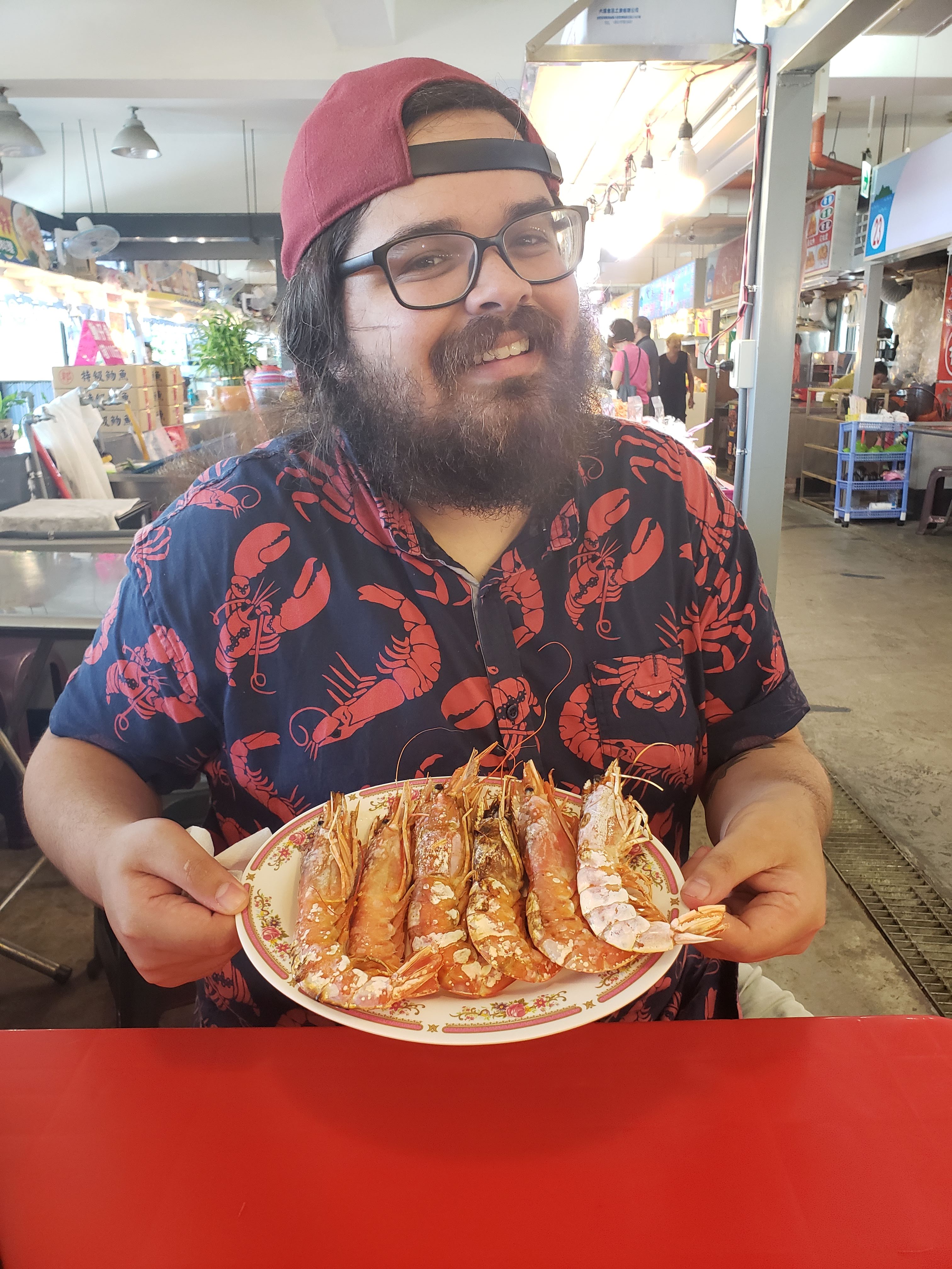 Rather than try to wrangle a bag full of raw fish on the train to cook it ourselves, we headed up into a big building just off the pier that was absolutely packed full of vendors and chefs. Two full floors of stalls brimming with some of our favorite dishes, plus types of fish we’d never even seen before! The language barrier didn’t pose much of a problem here—all we really had to do was point at what we wanted and they’d throw it on the grill—but a very friendly English-speaking shop owner spotted us as Americans right away and translated the things that weren’t quite so simple to order. With his help, we ate our fill of grilled fish, sashimi, fried rice, and absolutely GIGANTIC shrimp. Ryan even wore his shellfish shirt to celebrate the occasion.