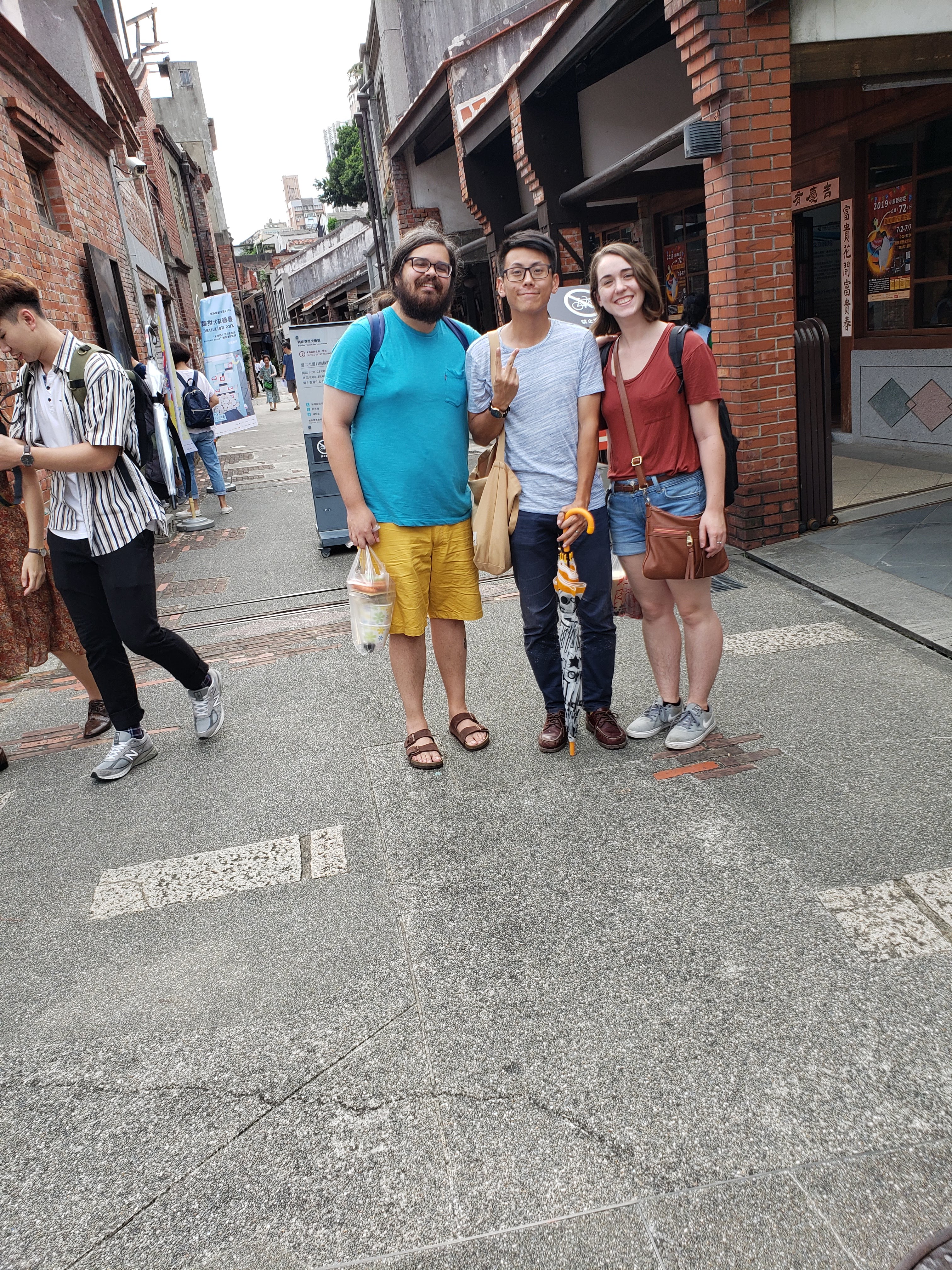 We ended our busy day in Taipei with a quick walk through the picturesque Bopiliao Historical Block, a red brick neighborhood that dates back to the late 19th century. It used to be a bustling commercial district, but these days it’s a tourist hotspot with a sprawling museum showcasing the area’s history and culture. We got a security guard to snap a few pictures of the three of us, reunited once again. As you can see, he had a bit of an…artistic eye, but as Jeff put it, we’re the best models he could have asked for!