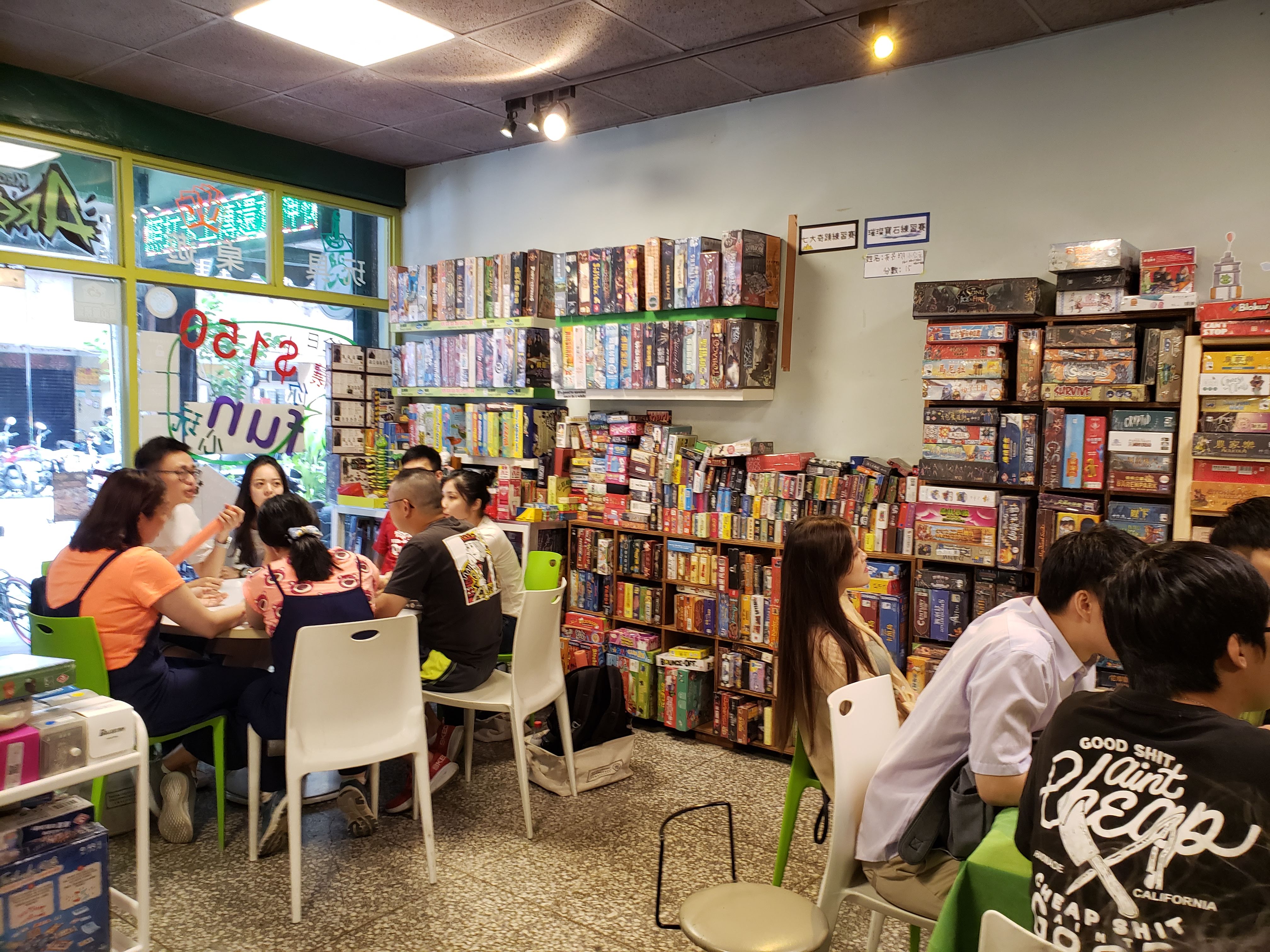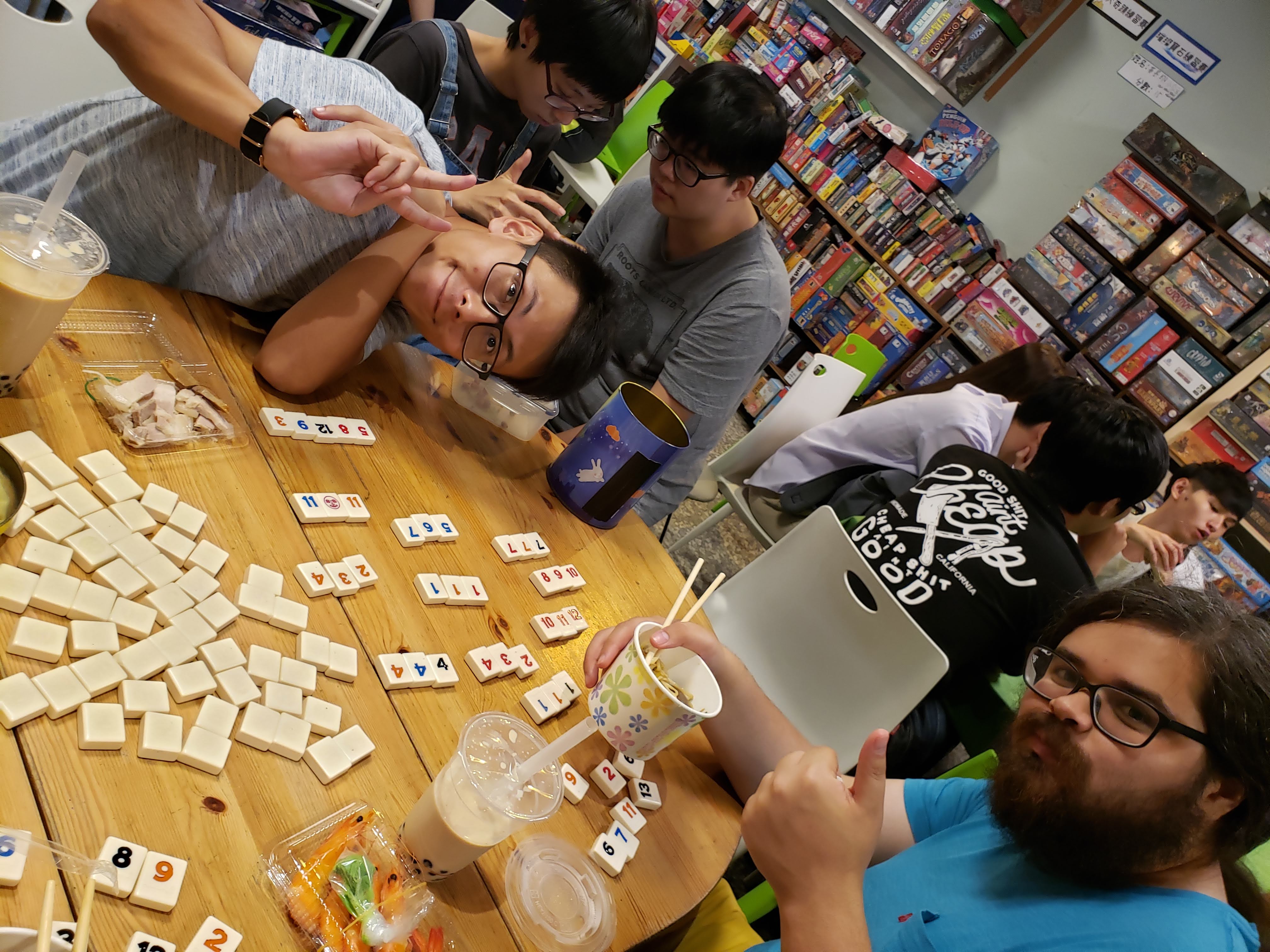 Seeing as we spent the better part of half an hour hovering around the board game booth, deciding whether we were brave enough get a game entirely in Mandarin (turns out we aren’t that brave quite yet), Jeff had the idea to go to a board game cafe down the street afterwards. Apparently, board game cafes are very popular among younger people in Taipei, and when we got to the shop it was absolutely packed with students and young people. If you know Ryan and I, you know we LOVE board games, so we grabbed an early dinner of noodles and bubble tea to go, and settled in for a few rounds of games. We noticed a few of our favorite titles on the shelves (“Betrayal at House on the Hill,” anyone?), so we’ll definitely be back for more games before long.