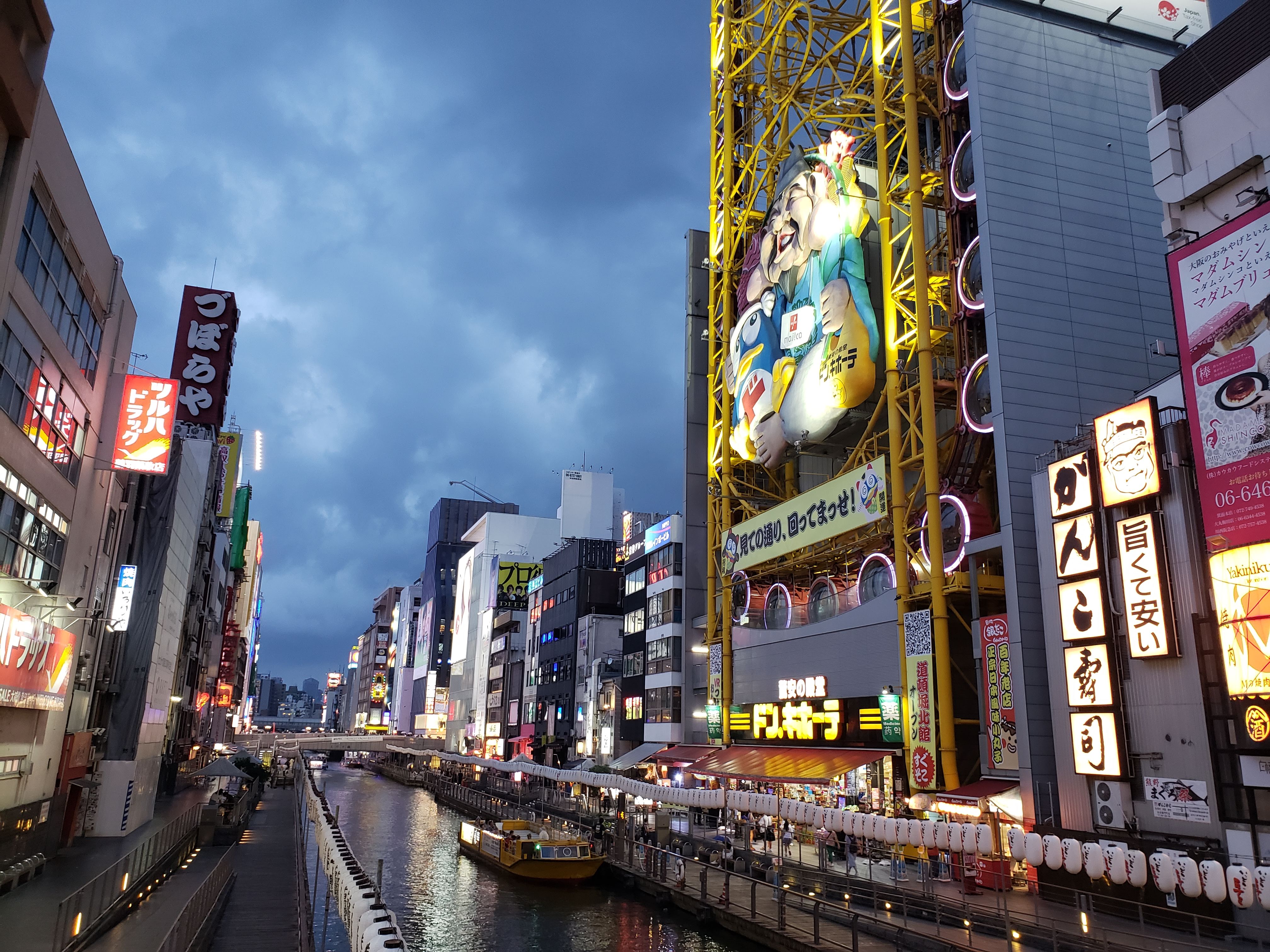 Glico is the company that makes Pocky, a biscuit-based snack that our friends back home are probably familiar with, and their mascot has been overlooking the Dotonbori Canal since the 1930s. Of course, back then he was made of wood, metal, and neon, while these days, the Glico Man glows down on Dotonbori with brilliant LEDs, making it that much easier to snap a shot with him.