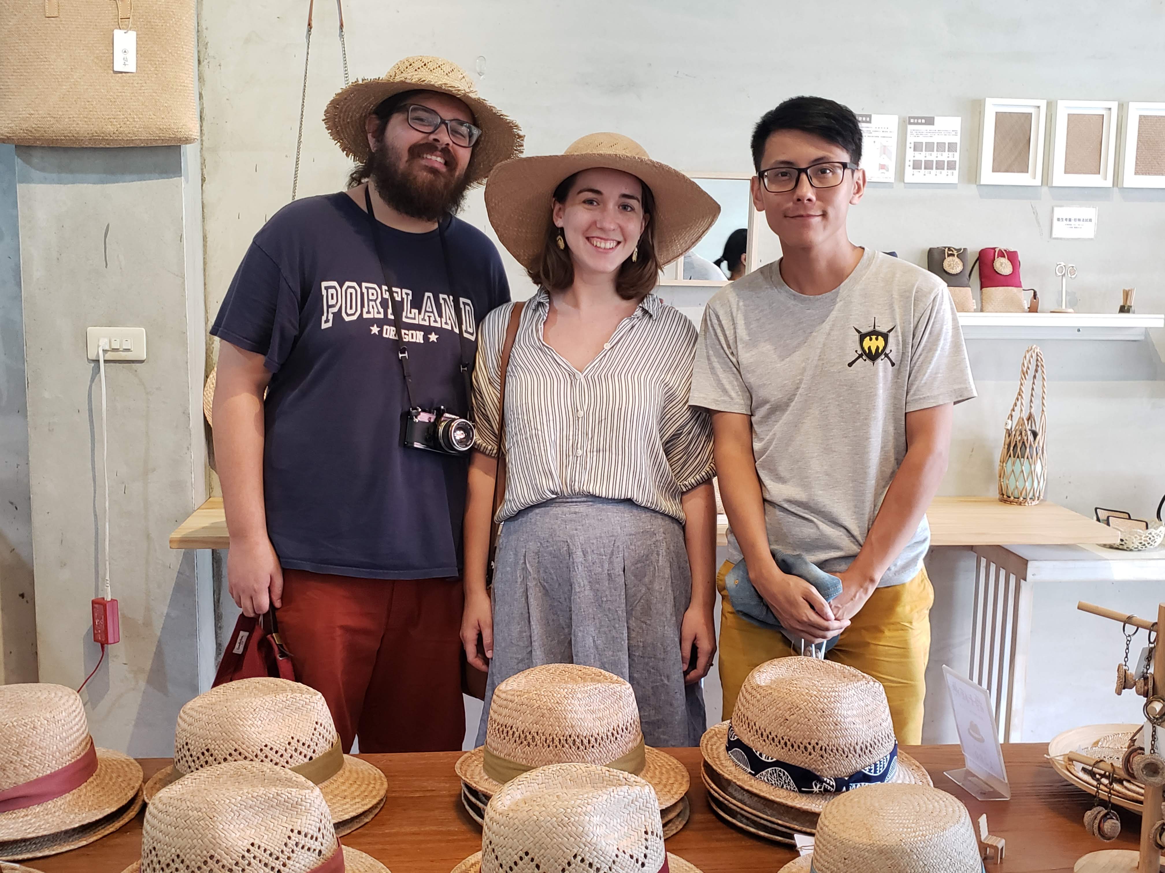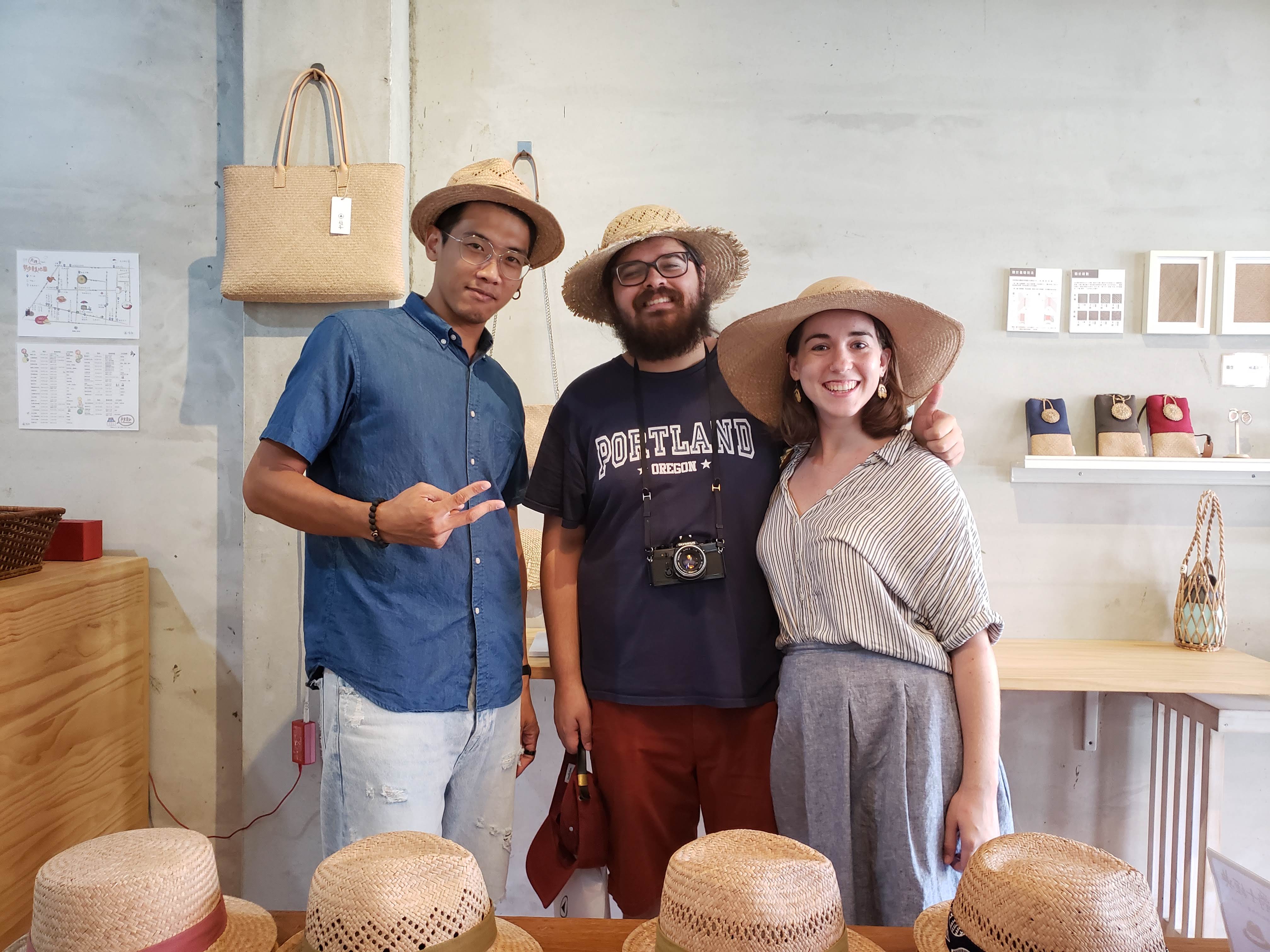 The business is booming these days, with locations all across Taiwan, but the store in Yuanli is the original. Jeff took us by the store and introduced us to the other owner, Yi-Shen, who showed us around the shop. We got to watch a bit of weaving being done and admired. Ryan and I each got our own hats, intricately designed and fragrant with the fresh, trademark scent of Yuanli rush.
